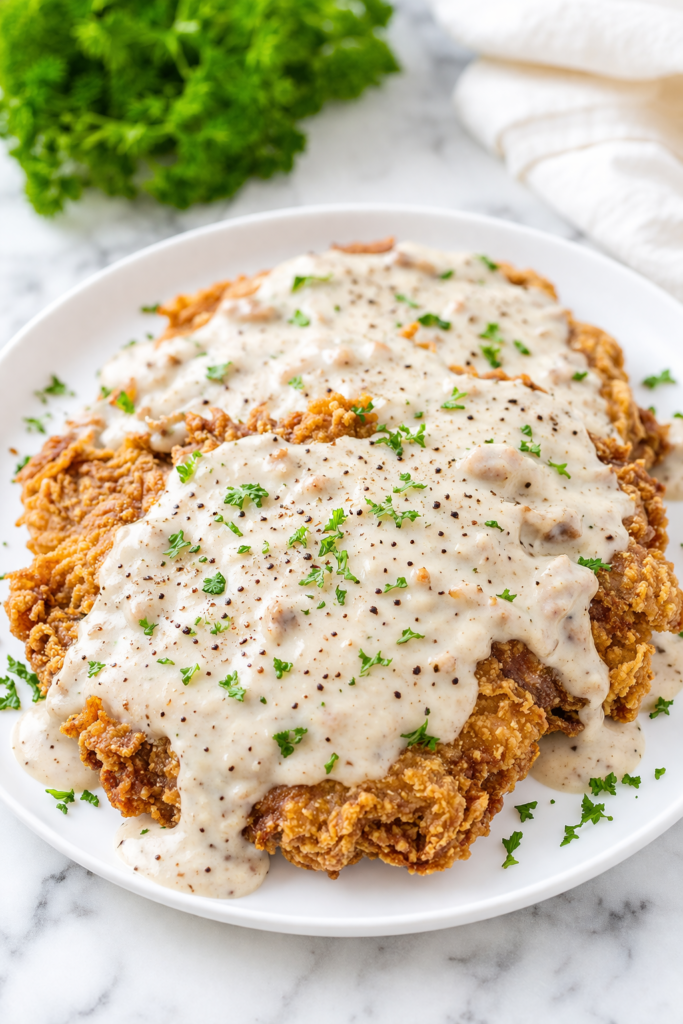 Heat oil in a skillet over medium heat (about 350°F). Fry steaks 3–4 minutes per side until golden brown and crispy. Remove and drain on paper towels. - Make the gravy
