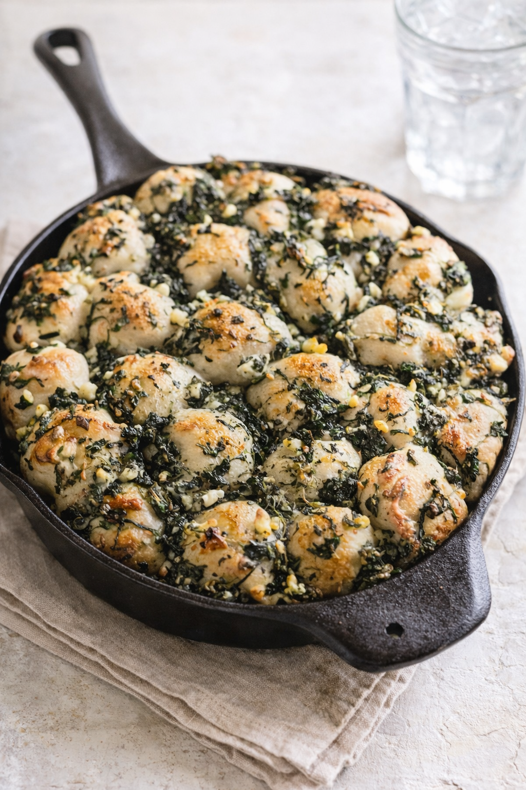 Soft, fluffy dinner rolls coated in a savory spinach and feta mixture, baked in a cast iron skillet until golden brown and melty. An easy Mediterranean-inspired appetizer perfect for holidays, brunch, or entertaining.