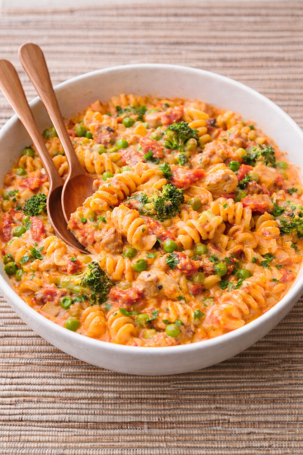 This easy one pot pasta rosa is rich, creamy, and packed with flavor. Made with rotini pasta, chicken, Italian sausage, broccoli, peas, and a tomato cream sauce, it’s the perfect comforting weeknight dinner with minimal cleanup.